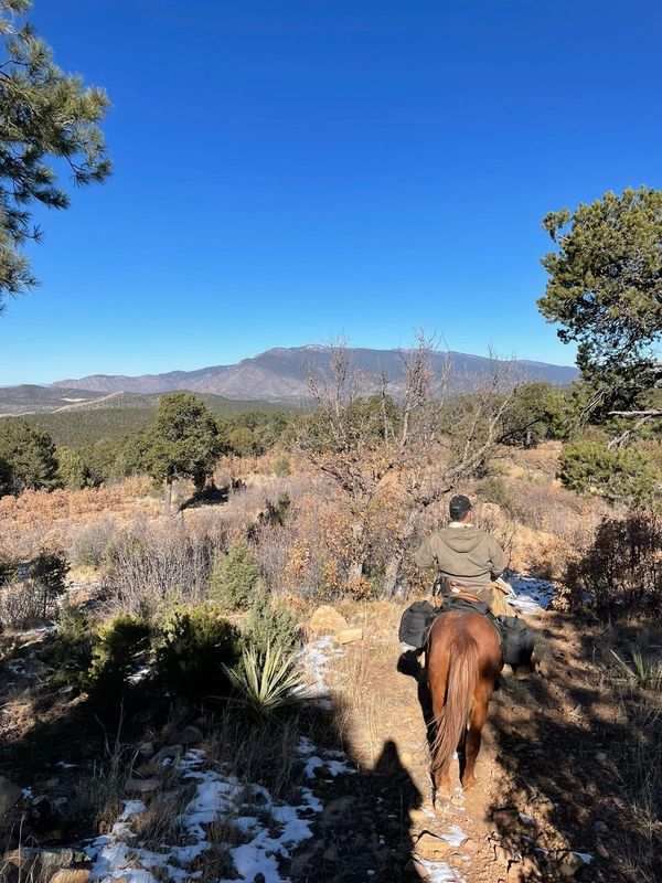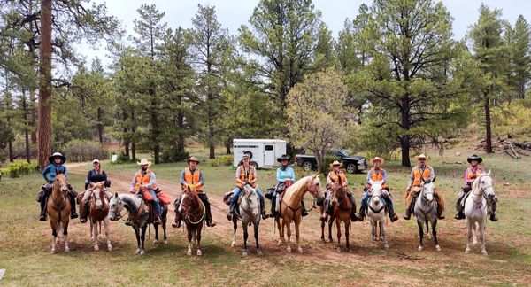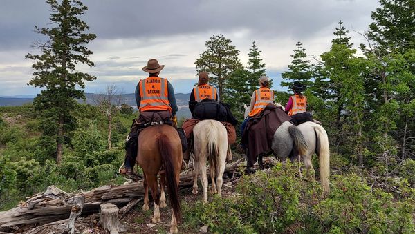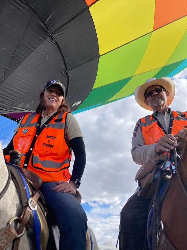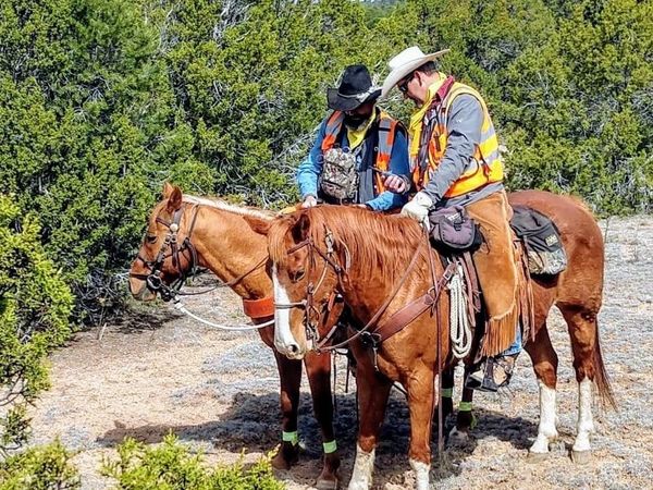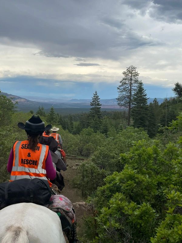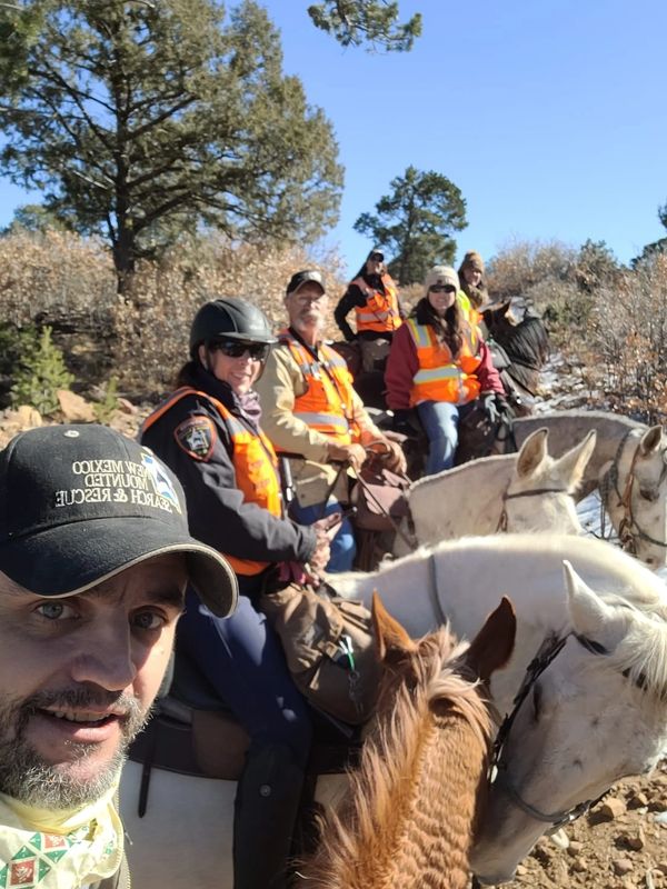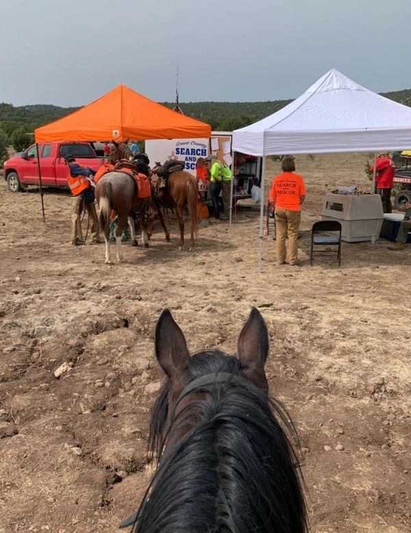 In New Mexico, a mounted searcher may be asked to ride many miles on a search lasting one operational period (up to 12 hours) in an unfamiliar area on flat, or mountainous terrain, at temperatures between 10 - 110 °F, at an altitude between 3,000 and 10,000 feet. This means that a searcher must be prepared for anything! Mounted searchers must also be prepared to hike for several miles in the event of an injured animal, or to stay overnight in the backcountry if necessary.